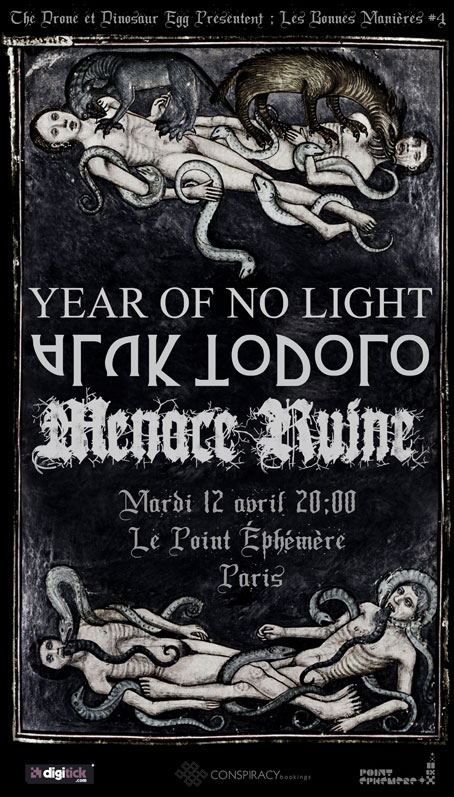 J'avoue tout. Mea Culpa. Je ne suis pas une fan de YEAR OF NO LIGHT de la première heure, c'est à dire d'au moins 2006, date de sortie du premier album. Non j'ai découvert le son du groupe il y a tout juste une semaine. Mais j'ai eu une épiphanie il faut bien le dire. Le hasard jouant en ma faveur pour le coup, ce qui est relativement rare, j'ai eu connaissance il y a une semaine justement qu'ils étaient en tournée sur Paris. Après avoir rongé mon frein pendant 3 bonnes heures, j'ai décidé d'être folle et de grever un peu plus mon petit budget et, d'écouter mon coeur.